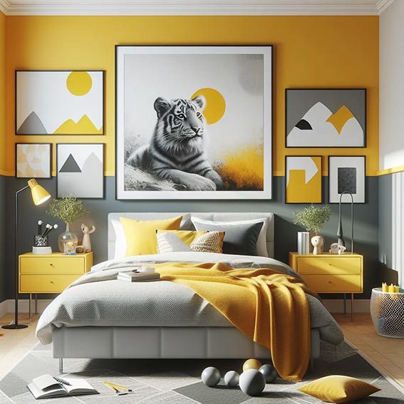 Questo approccio offre un’opportunità straordinaria di creare un ambiente stimolante e dinamico. Dai quadri accattivanti alle coperte avvolgenti, i contrasti audaci possono essere integrati in ogni aspetto della cameretta, rendendola un vero rifugio per l’esplorazione creativa. Incorporare colori come il giallo e il grigio non solo aggiunge vivacità, ma crea anche un punto focale che cattura l’attenzione. Un esempio che colpisce è per esempio il mix di una parete gialla vivace con mobili grigi e accessori in contrasto. Il risultato? Una stanza vivace, ricca di personalità e fuori dagli schemi convenzionali.