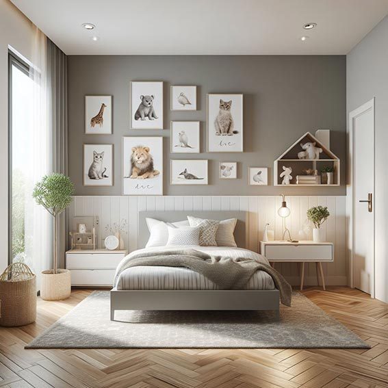 Ad esempio, in questo progetto ho lavorato con una mamma appassionata di decorazioni animali che ha abbracciato questa idea per la cameretta della sua piccola. La scelta di uno schema cromatico neutro per la cameretta ha permesso alle stampe di animali sulla parete di emergere come vere protagoniste, creando un’atmosfera giocosa e accogliente. Questi colori neutrali per pareti e arredi offrono un’opportunità infinita di personalizzazione con accessori e decorazioni tematiche. Un tappeto colorato, cuscini divertenti o quadri creativi possono poi trasformare la stanza a seconda dell’umore del momento o degli interessi in evoluzione dei tuoi figli. Inoltre, questa palette di colori è adatta ad accogliere proprio tutti ed è l’ideale per camerette condivise tra fratelli e sorelle.